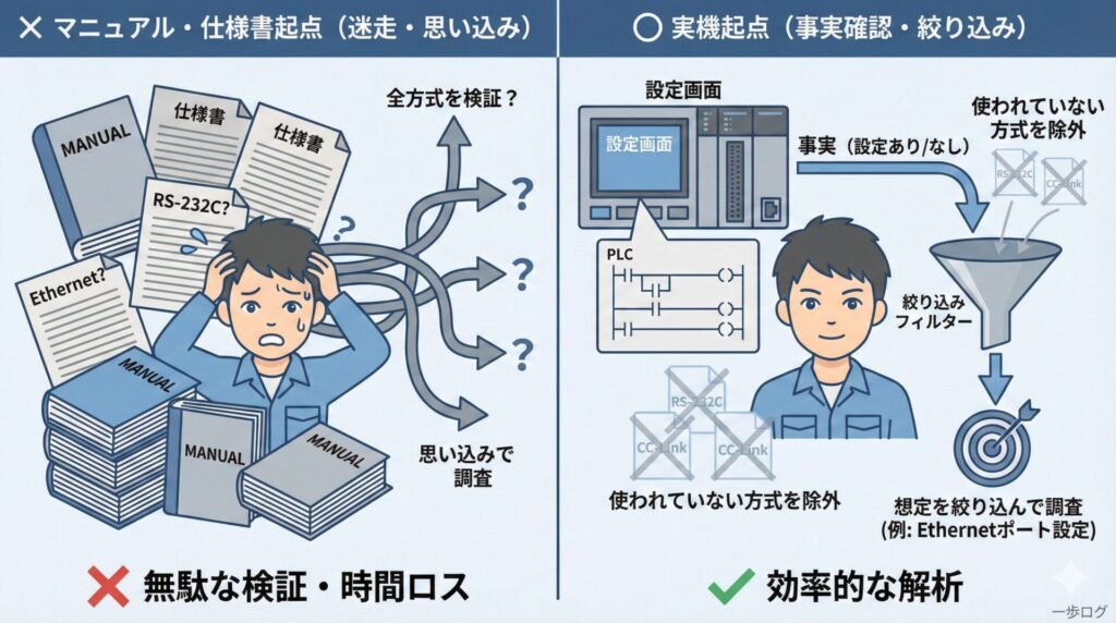 古い設備解析では、知識量よりも判断の軸が結果を左右しますが、その軸を冒頭から一貫して「実機の動きを正解にする」と定義していました。