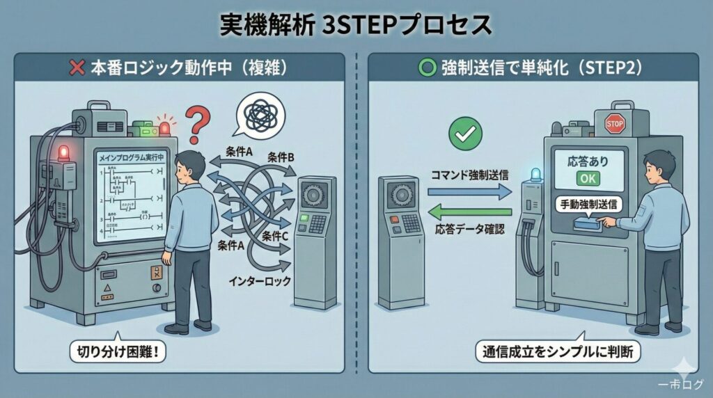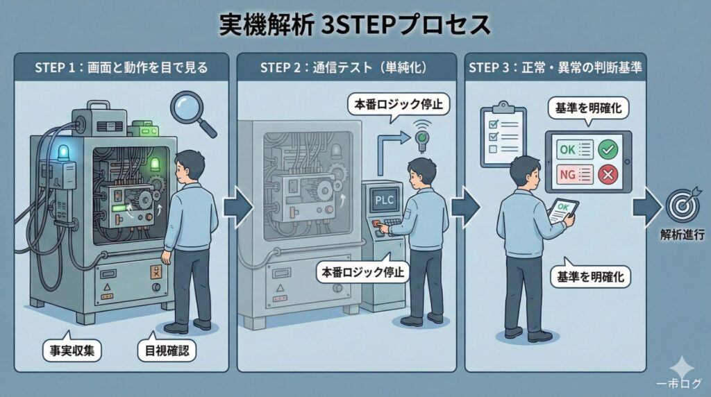 実機確認→簡易テスト→ロジック確認という順序は、現場での手戻りや無駄な調査工数を確実に減らします。