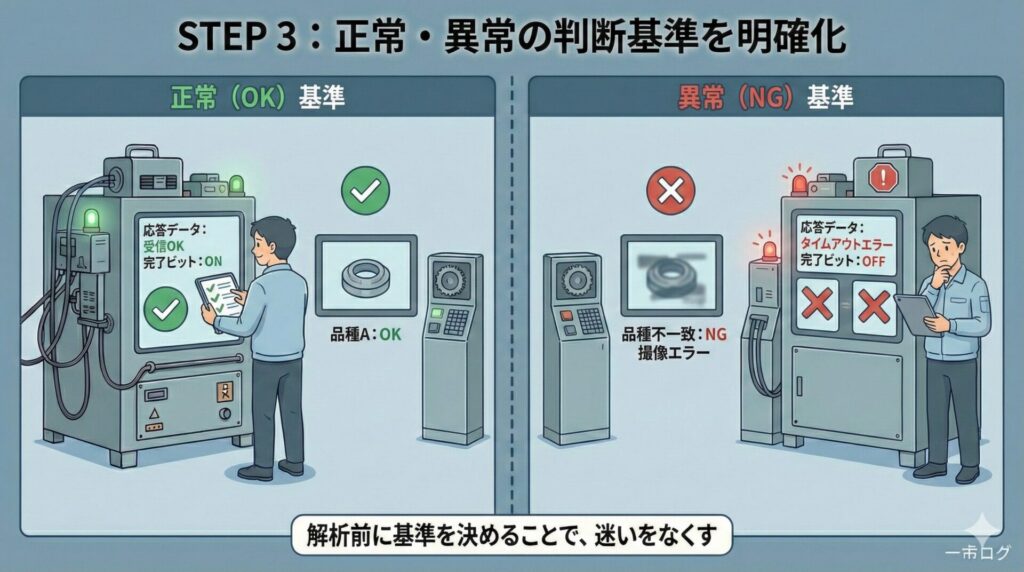 例えば、応答データが返ってくること、画像センサ側の画面が切り替わること、完了ビットが立つことなど、判断基準を明確にします。