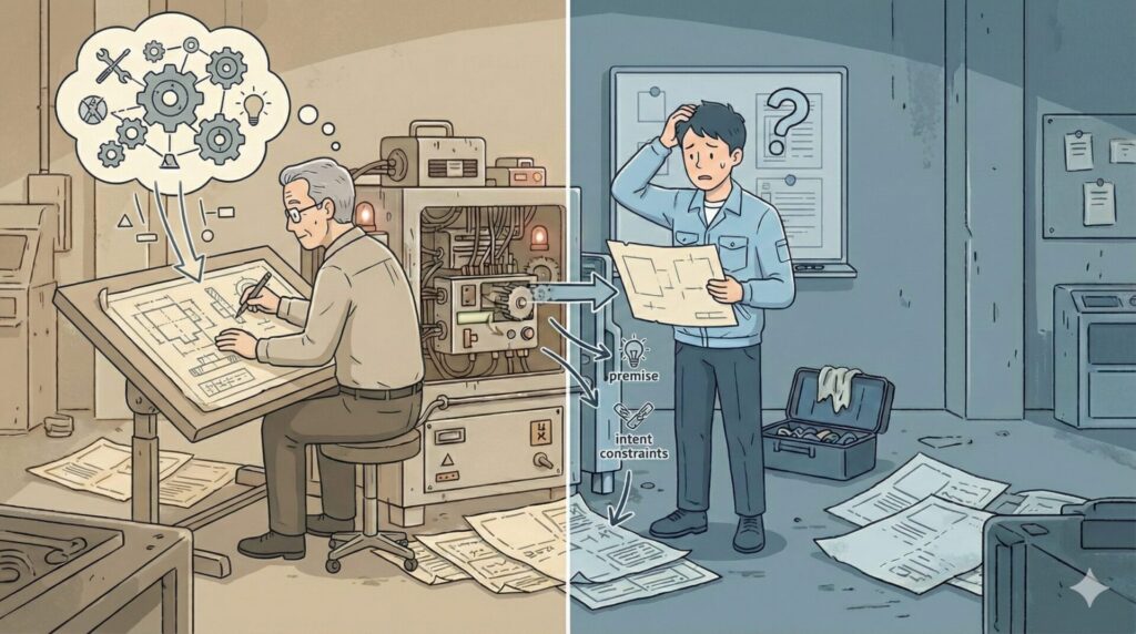 - 設計者の判断基準や制約は、図面や仕様書に残っていない