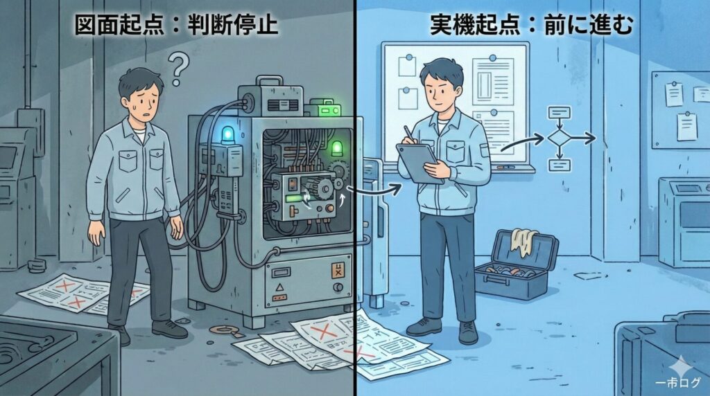 一方、図面や仕様書から入ると、前提条件が崩れた瞬間にすべてが疑わしくなり、判断が止まります。