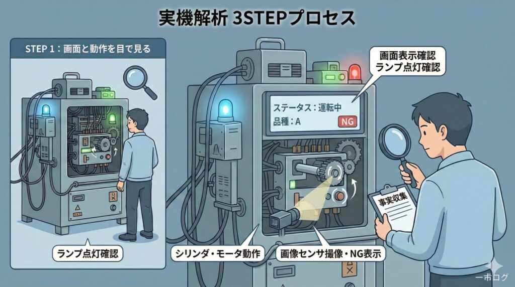解析の最初にやるべきことは、プログラムを見ることではありません。設備の画面、表示ランプ、シリンダやモータの動きを、実際に目で確認することです。