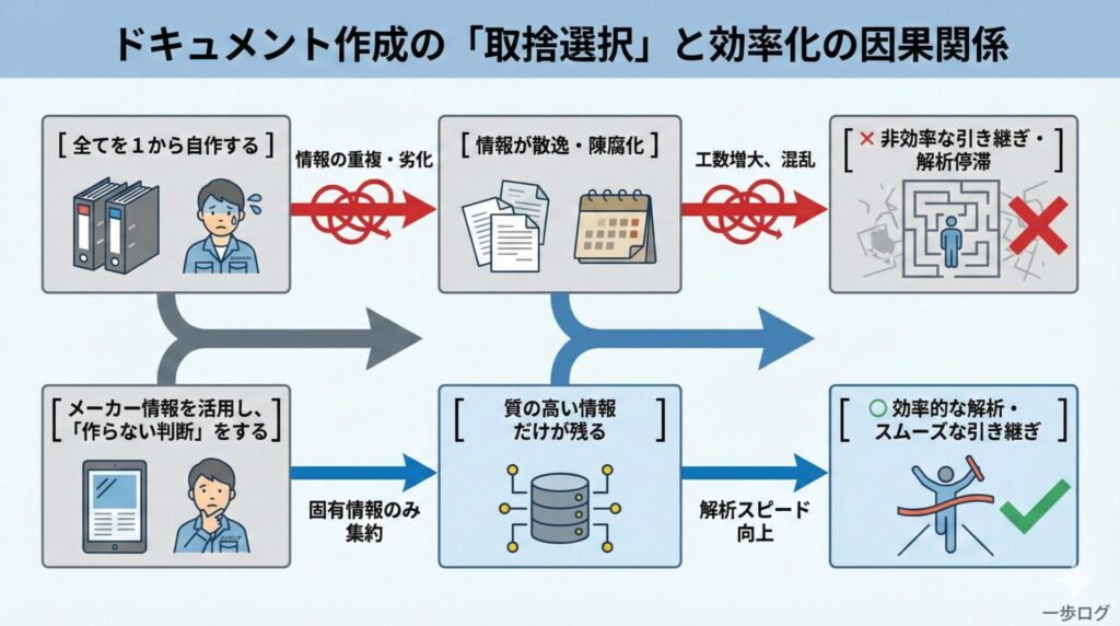 残すべきなのは、その設備特有の判断や例外処理だけです。作らない判断をすることで、解析と引き継ぎの効率はむしろ上がります。