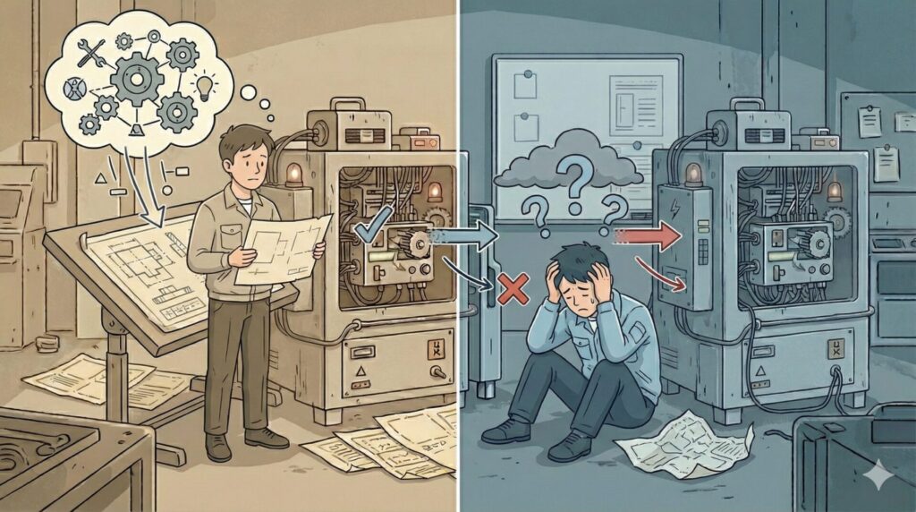 特に10年以上前の設備では、設計意図が分からずに図面通りに追うほど実機と食い違いが増えます。