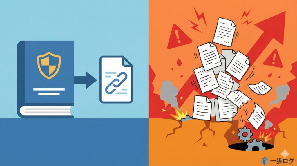 自作資料で置き換えると、情報の劣化や更新漏れのリスクが高まります。